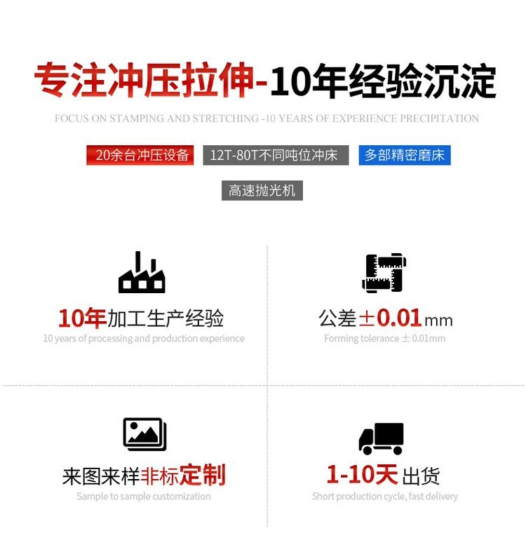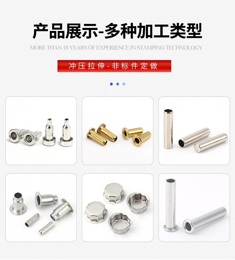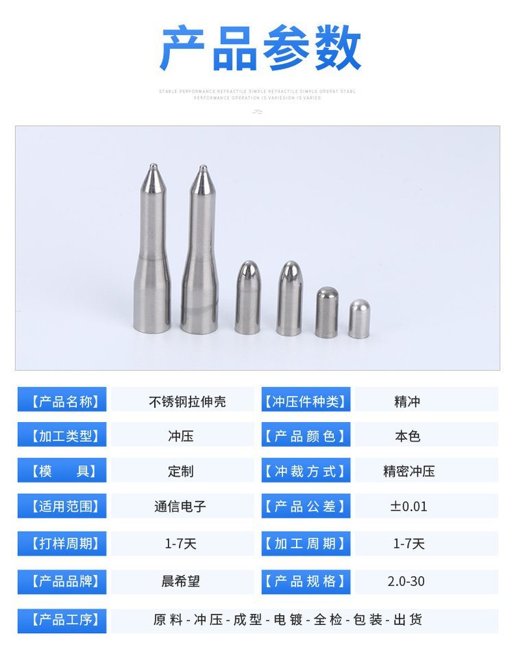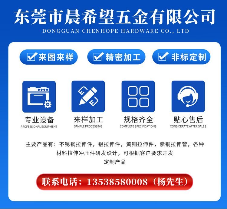 东莞市晨希望五金有限公司座落于中国广东省东莞企石镇成立于2015年!是一家专业从事金属冲压拉伸、销售、制造、服务为一体的专业公司,专注于冲压拉伸的技术创新与品质,致力打造"晨希望品牌 主要产品有:电阻帽、铜管、铆钉、鸡眼钉不锈钢探头、插件、拉伸 冲压件、研发设计模具可根据客户要求开发、定制产品。